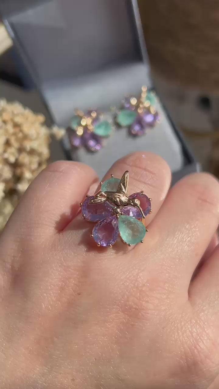 Conjunto Brinco e Anel Beija Flor Ametista e Turmalina