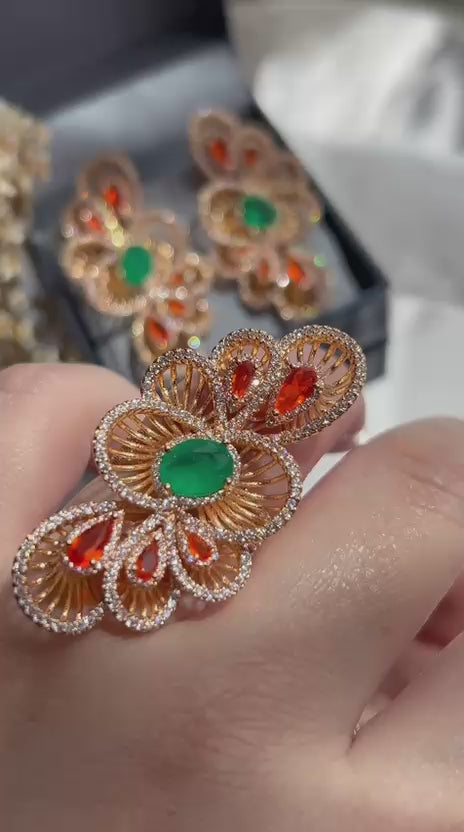 Conjunto Brinco e Anel Camadas Verde Esmeralda com Tangerina