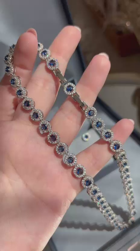 Conjunto Brinco e Colar Riviera Pedras Redondas Azul Safira